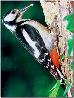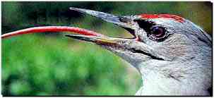 Pour se saisir de ces succulentes bestioles qu'il adore, surtout en larves, l'épeiche insinue sa longue langue vermiforme (c'est à dire en forme de vermicelle), à l'intérieur des trous creusés dans le bois par des insectes. |