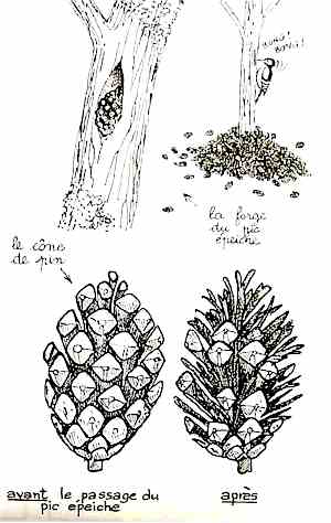 Le pic épeiche se trouve un arbre pourvu d'une crevasse ni trop large, ni trop étroite et il y coince une pomme de pin (un cône) parfois apportée de très loin, sur laquelle il tape frénétiquement du bec jusqu'à ce qu'en soient extraites toutes les petites graines (pas mauvaises du tout parait-il) qui s'y trouvaient. Une fois le cône déchiqueté, il l'arrache de son "enclume" et le remplace par un autre. C'est ainsi qu'on a pu trouver un amas de plusieurs centaines de cônes épluchés par le pic épeiche qui entouraient la base d'un jeune saule marsault. |