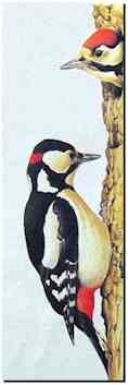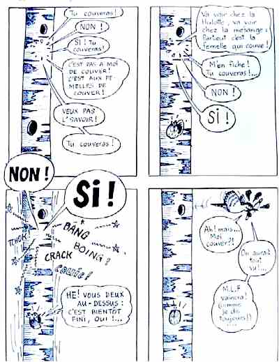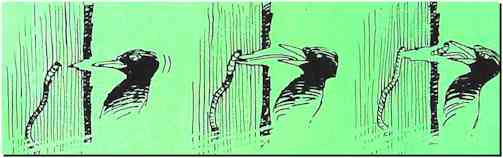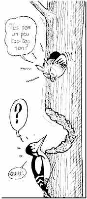 "Il", bien sûr, c'est le mâle car, chez les pics, le père de famille n'est nullement exempté de cette fastidieuse corvée qui consiste à passer des heures et des heures allongé sur des oeufs qu'il faut en permanence tenir bien au chaud. Beaucoup de spécialistes seraient même d'accord pour dire que le malheureux couve plus souvent qu'à son tour!... Chez les pics en effet, la femelle entend bien ne pas être la seule à couver. Cette légitime exigence donne quelquefois lieu à quelques petites altercations, ainsi qu'en témoigne ce document, rapporté par l'envoyé spécial de "La Hulotte". |