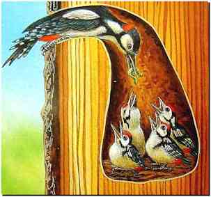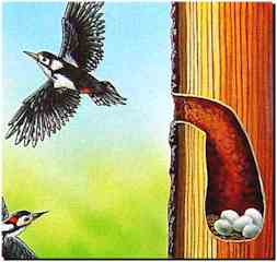 Son nid creusé, la mère pic, qui tient à élever ses gosses à la dure, prépare, vite fait bien fait, un matelas peu confortable formés de copeaux rugueux sur lequel elle dépose ses 4, 5 ou 6 œufs blancs, pécialement luisants. Un par jour. Au dernier, il commence à couver. |