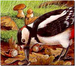 Ajoutons qu'en plus des insectes, le pic épeiche sait profiter de toutes les occasions: noyaux, glands, faînes, noix, noisettes, baies de toutes dimensions etc... Il lui arrive aussi de lécher la sève coulant des arbres et, par grand froid, de s'inviter -quel culot!- aux postes de nourrissage accrochés aux arbres par les protecteurs de nos amis les oiseaux...