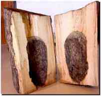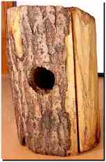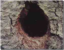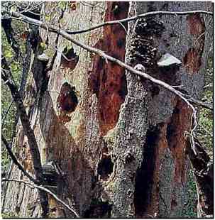 le bec légèrement entrouvert, il frappe à coups redoublés dans le tronc et en extrait de larges copeaux qu'il laisse tomber à terre. Le bruit occasionné par ce travail n'a rien à voir avec le "tambourinage" que nous évoquions tout à l'heure : il s'agit cette fois de coups laborieux, plus espacés et beaucoup moins sonores. |
